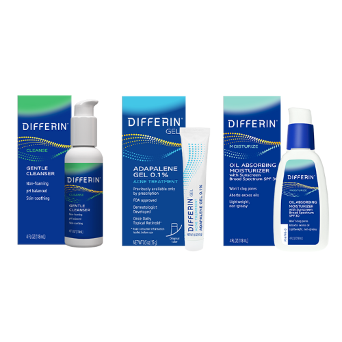 Een milde reiniger, een retinoïde met receptsterkte die acne diep in de poriën aanpakt en uitbraken voorkomt, en een SPF 30 lotion.