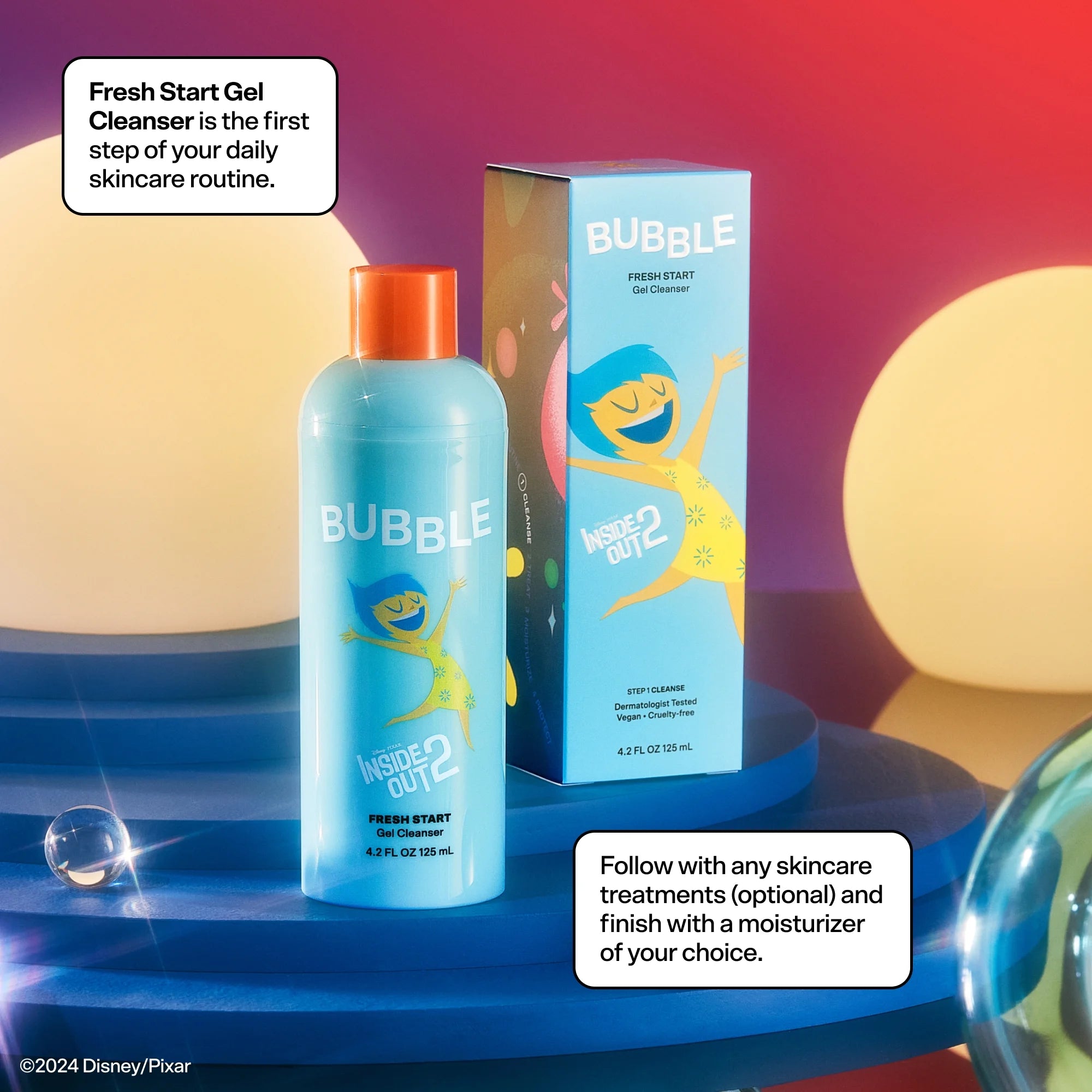 De Bubble Skincare Inside Out 2: Fresh Start and Joy Gel Facial Cleanser is een milde, verfrissende gezichtsreiniger geïnspireerd door de film Inside Out 2. De zachte formule verwijdert vuil, olie en make-up zonder de huid uit te drogen. Laat de huid schoon, zacht en gehydrateerd aanvoelen. Geschikt voor alle huidtypes.