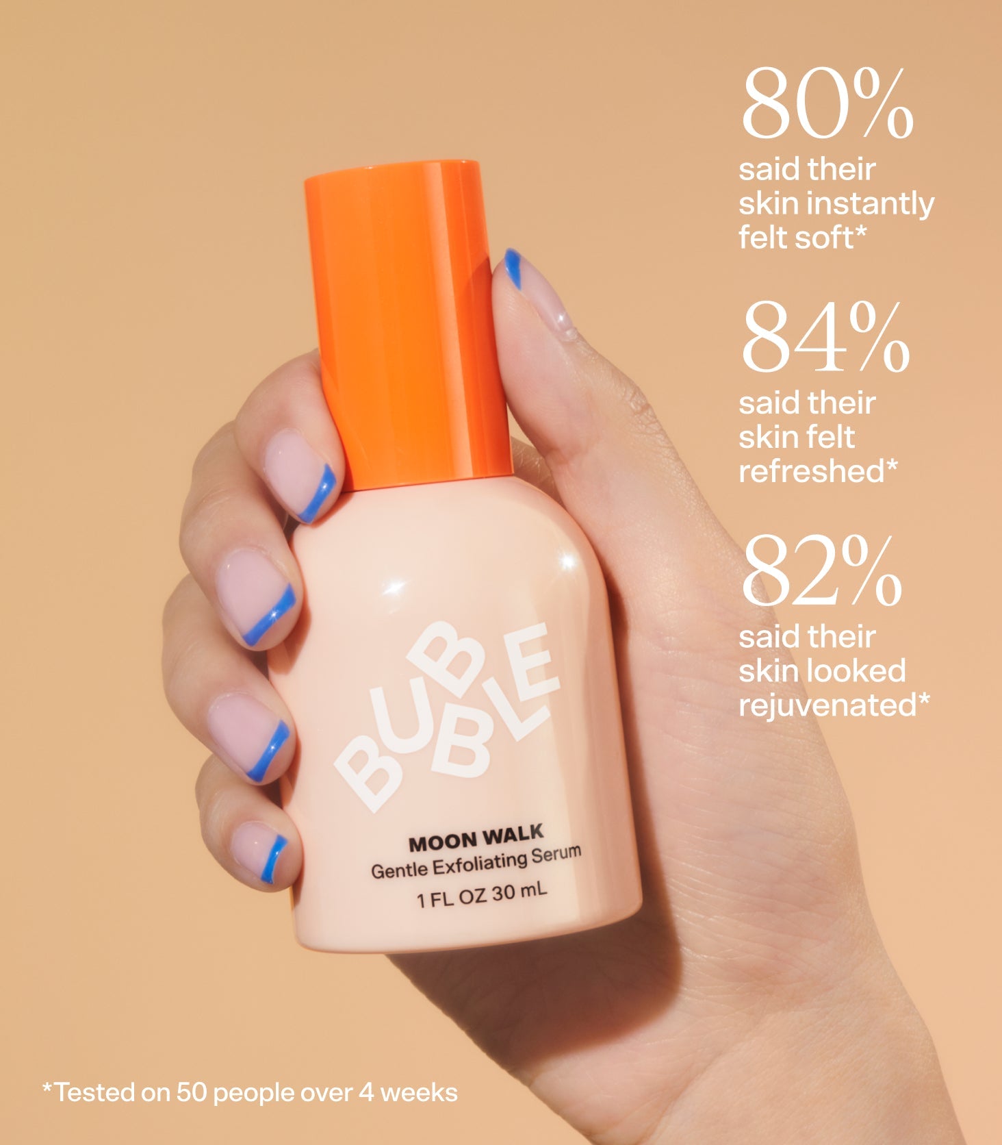 Het Bubble Skincare Moon Walk Gentle Exfoliating Serum is een milde exfoliant die de huidtextuur verfijnt en een gezonde glow bevordert. De formule met AHA en BHA verwijdert dode huidcellen, reinigt poriën en helpt onzuiverheden te verminderen zonder de huid te irriteren. Geschikt voor alle huidtypes, ook de gevoelige huid.