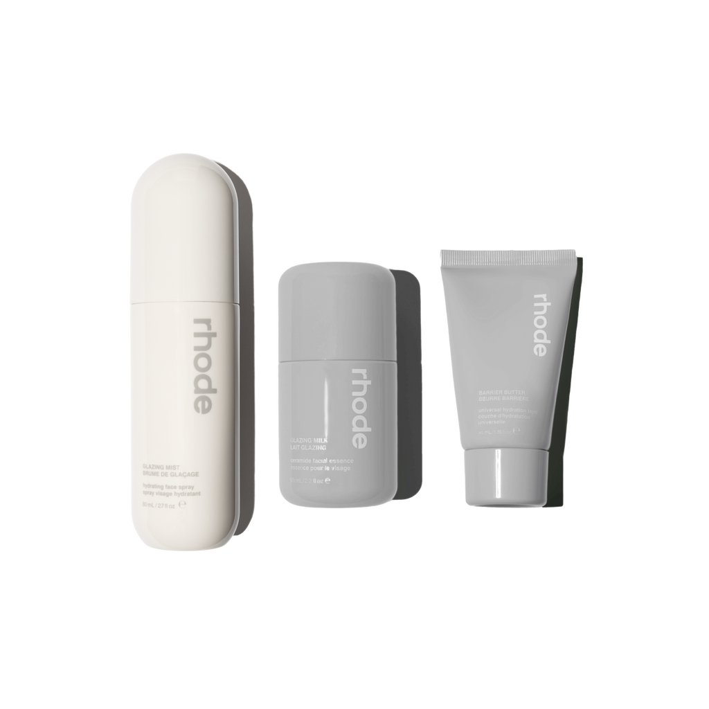 Full-size Glazing Mist (80 ml), mini Glazing Milk (65 ml), en mini Barrier Butter (40 ml).