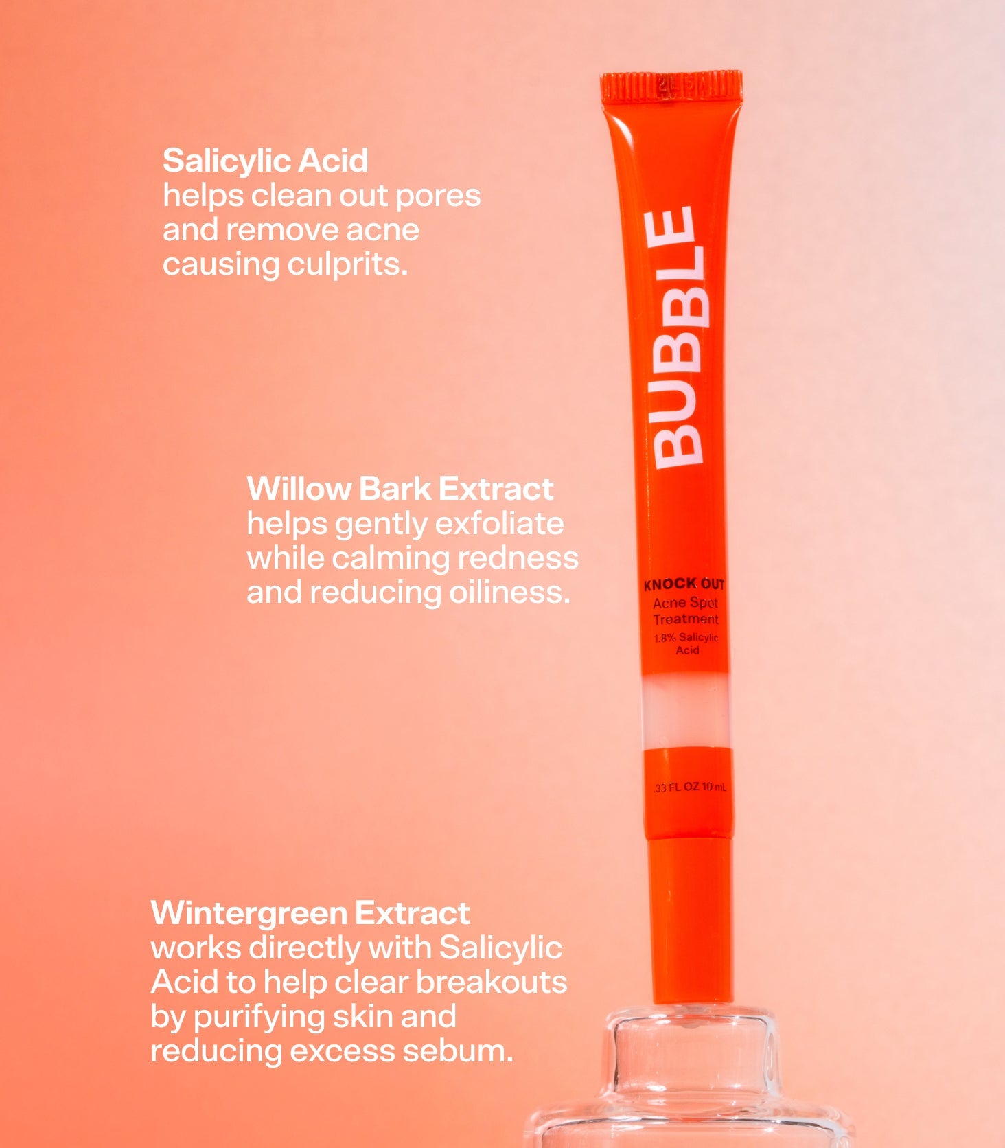 De Bubble Skincare Knock Out Acne Spot Treatment is een gerichte behandeling tegen puistjes en onzuiverheden. Met 1.8% salicylzuur en natuurlijk wintergreen-extract helpt de formule poriën te ontstoppen, roodheid te verminderen en nieuwe uitbraken te voorkomen. De milde, niet-uitdrogende gel droogt snel en is geschikt voor alle huidtypes, ook de gevoelige huid.