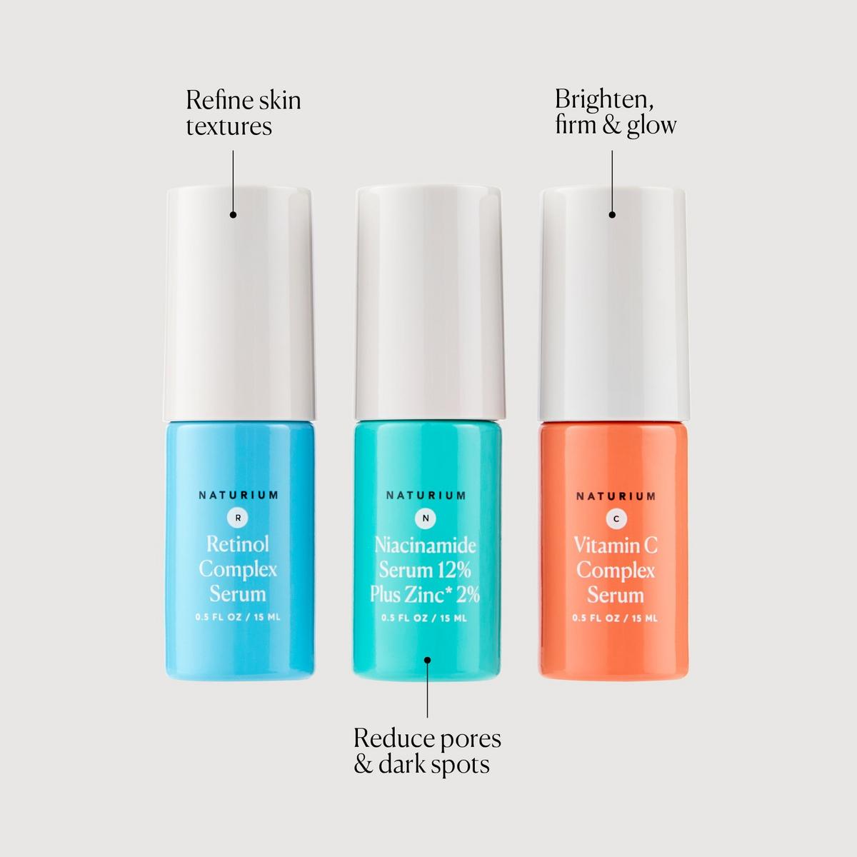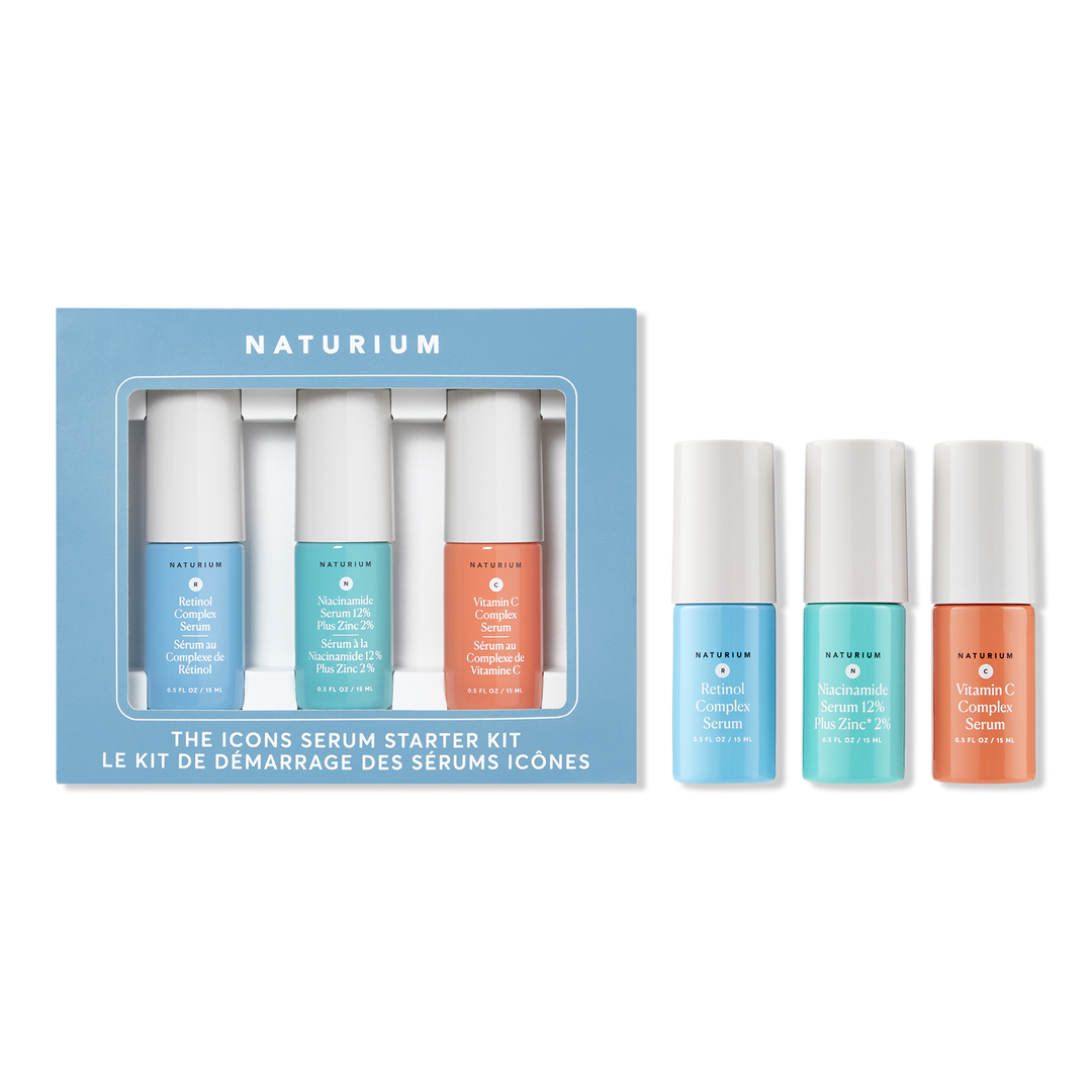 Laat de teint er jeugdiger uitzien met de Naturium The Icons Serum Starter Kit, een set van drie serums die in laagjes kunnen worden aangebracht om zichtbare tekenen van veroudering aan te pakken. Deze huidverzorgingsset bevat Niacinamide Serum 12% Plus Zink 2%, Vitamine C Complex en Retinol Complex Serums.