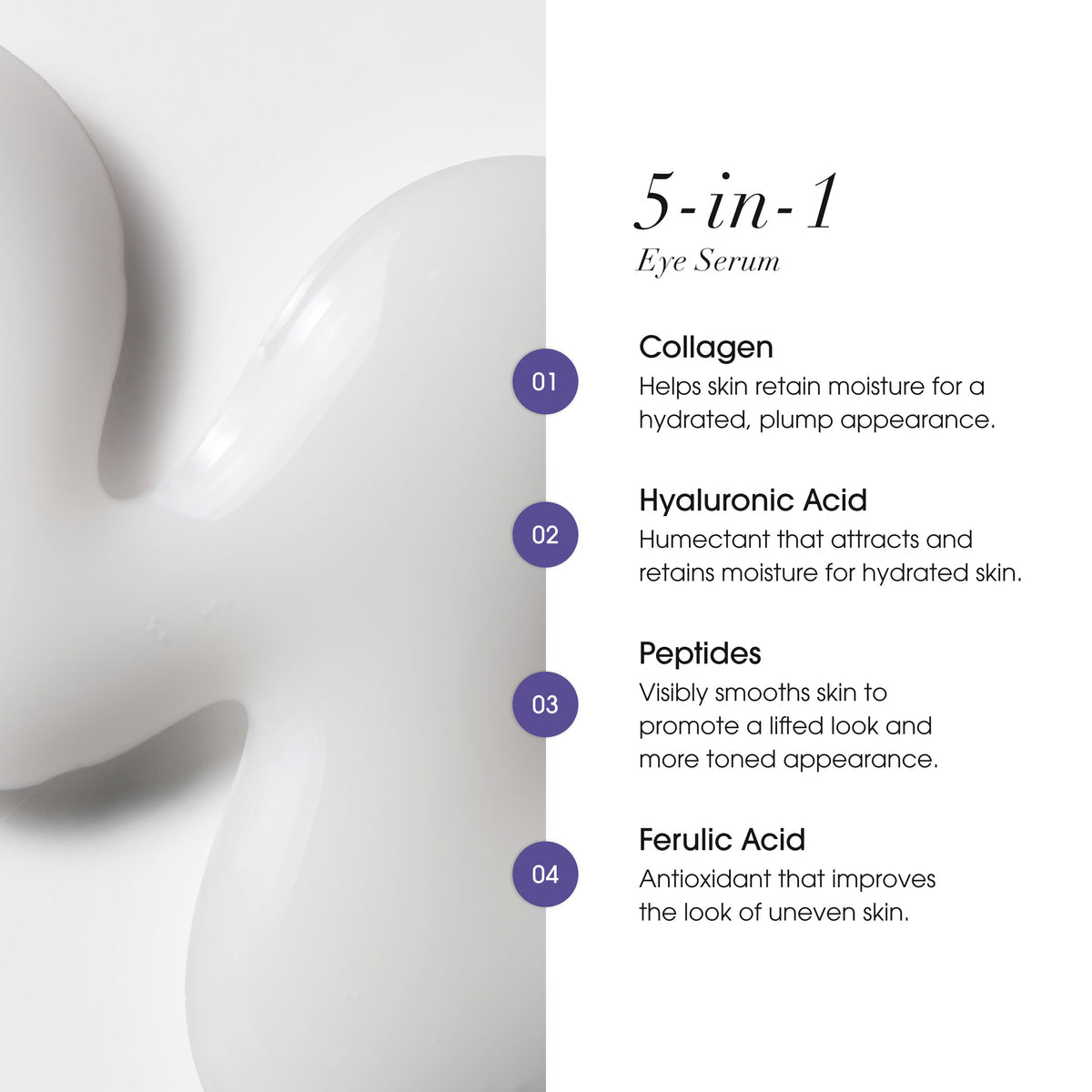 Advanced Clinicals Complete 5-in-1 Eye Serum is een multifunctioneel oogserum dat helpt bij het verminderen van rimpels, wallen, donkere kringen, fijne lijntjes en een slappe huid rondom de ogen. De krachtige mix van peptiden, plantenextracten en hyaluronzuur hydrateert, verstevigt en verheldert voor een frisse en jeugdige oogopslag.