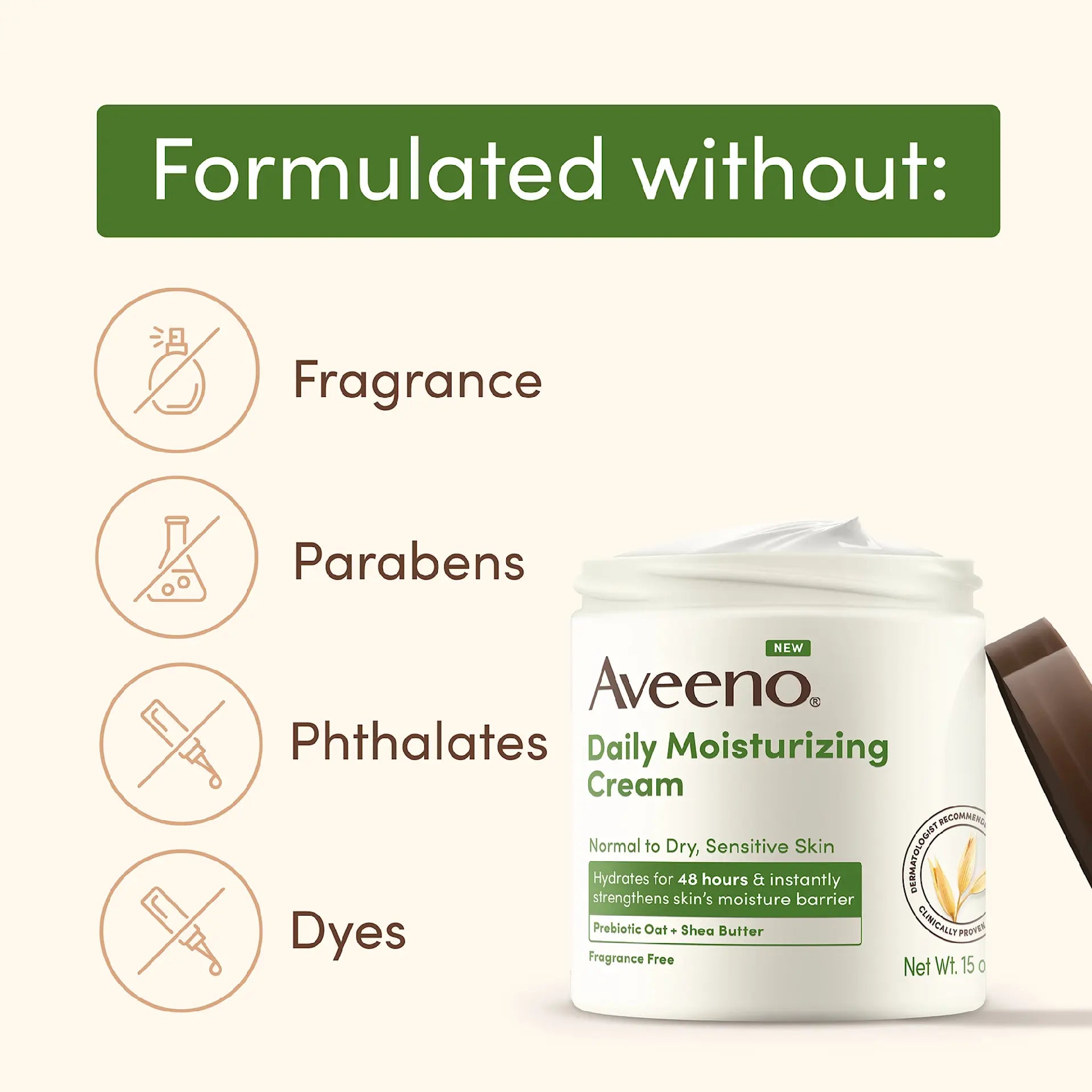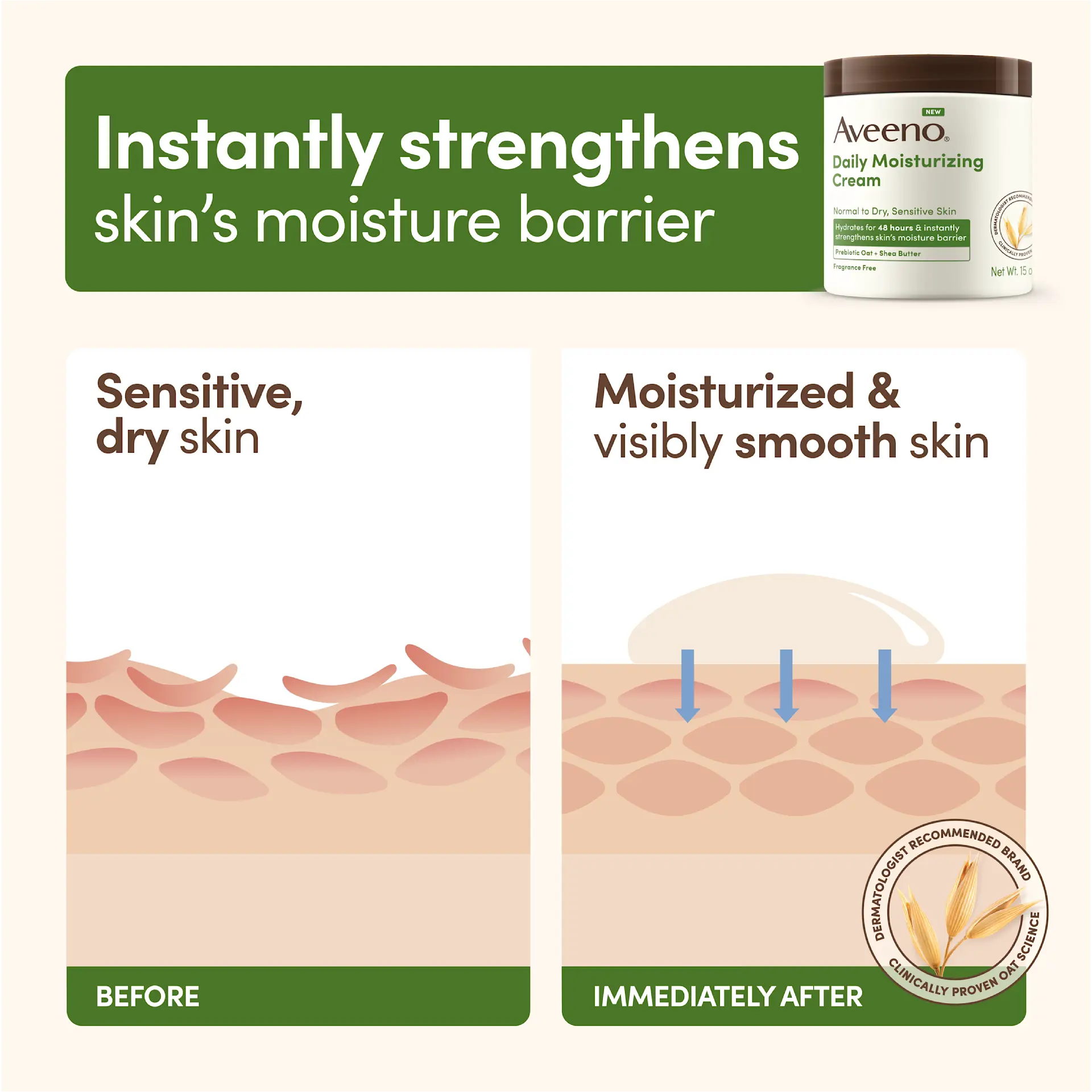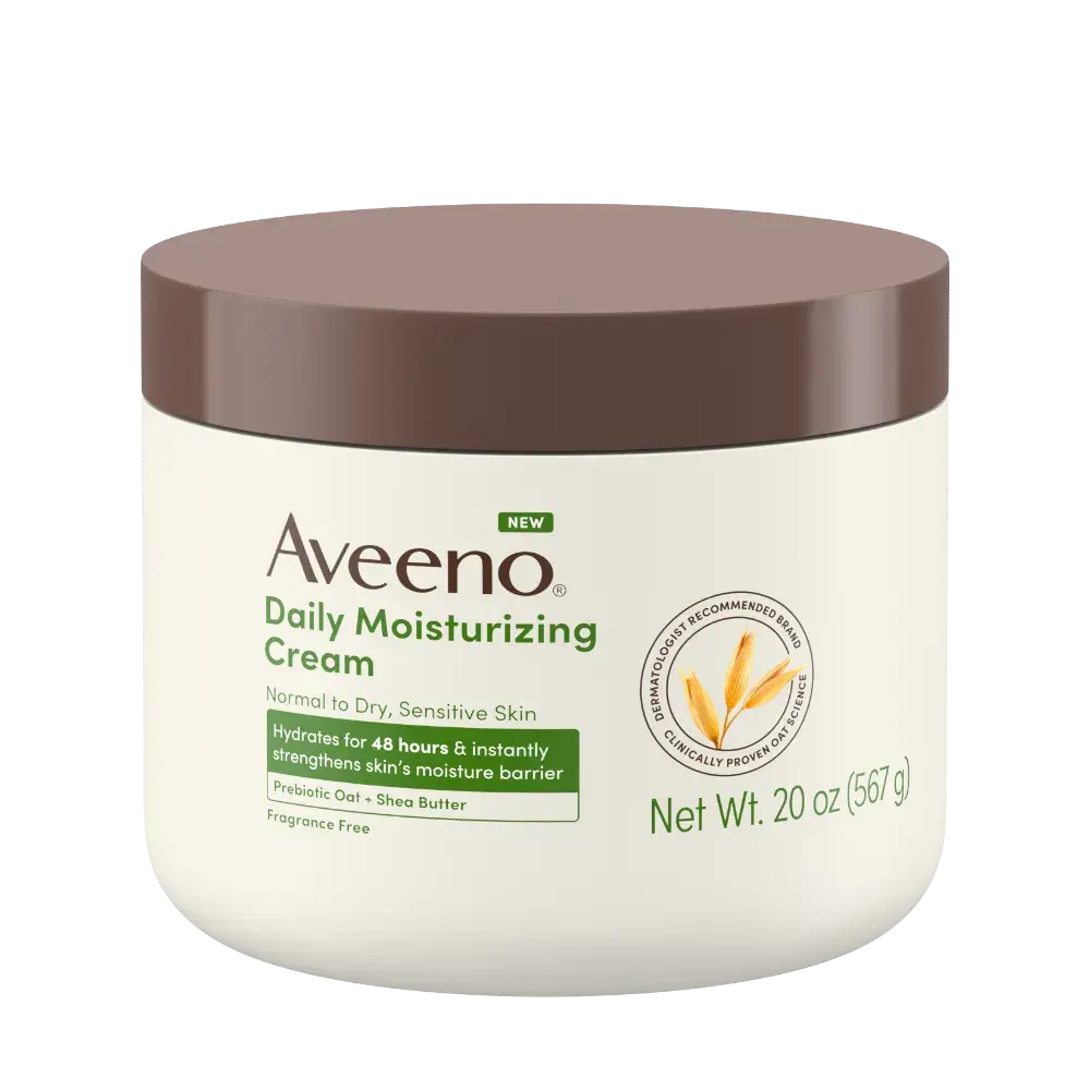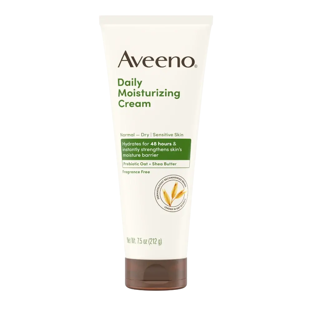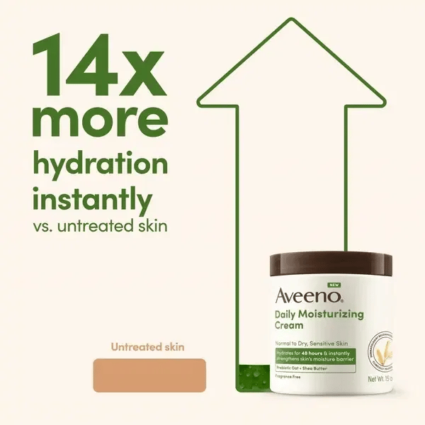 De Aveeno Daily Moisturizing Cream met haver en sheaboter hydrateert intens en herstelt de natuurlijke balans van de huid. De rijke, zachte formule voedt en verzacht droge of gevoelige huid en houdt haar langdurig gehydrateerd.