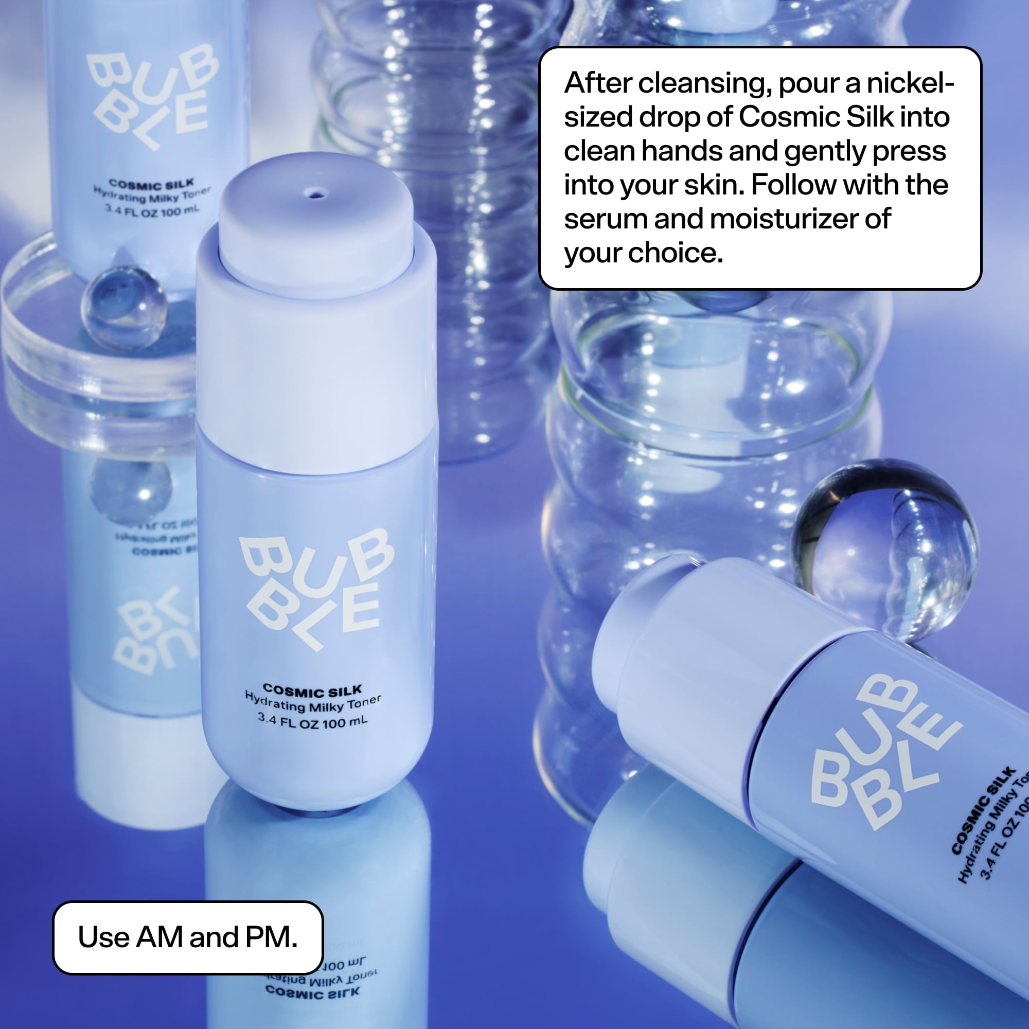 De Bubble Skincare Cosmic Silk Hydrating Milky Toner is een milde, hydraterende toner die de huid kalmeert en voorbereidt op de rest van je routine. De melkachtige formule verzacht, herstelt de natuurlijke vochtbalans en laat de huid fris en soepel aanvoelen. Geschikt voor dagelijks gebruik en alle huidtypes, ook de gevoelige huid.