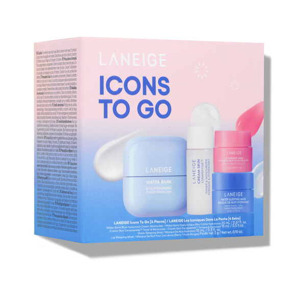 Hydrateer en voed de lippen en het gezicht met Laneige Icons To Go, een huidverzorgingsset bestaande uit Water Bank Cream Moisturiser, Cream Skin Cerapeptide™ Toner & Moisturiser, Water Sleeping Mask en Lip Sleeping Mask Berry.