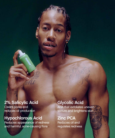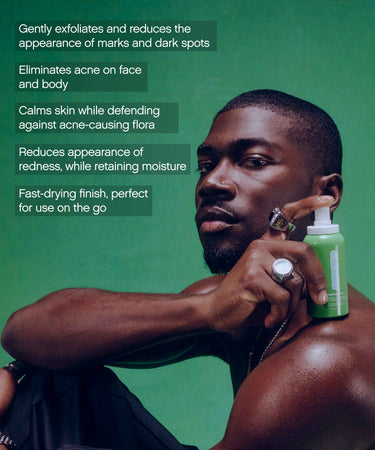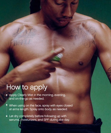 Een krachtige acne-mist voor gezicht en lichaam die puistjes, mee-eters en whiteheads vermindert, terwijl het de geïrriteerde huid kalmeert en verzacht. Dagelijks en onderweg te gebruiken om overtollige talg te reguleren, roodheid te verminderen en een egale teint en huidstructuur te behouden.