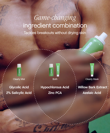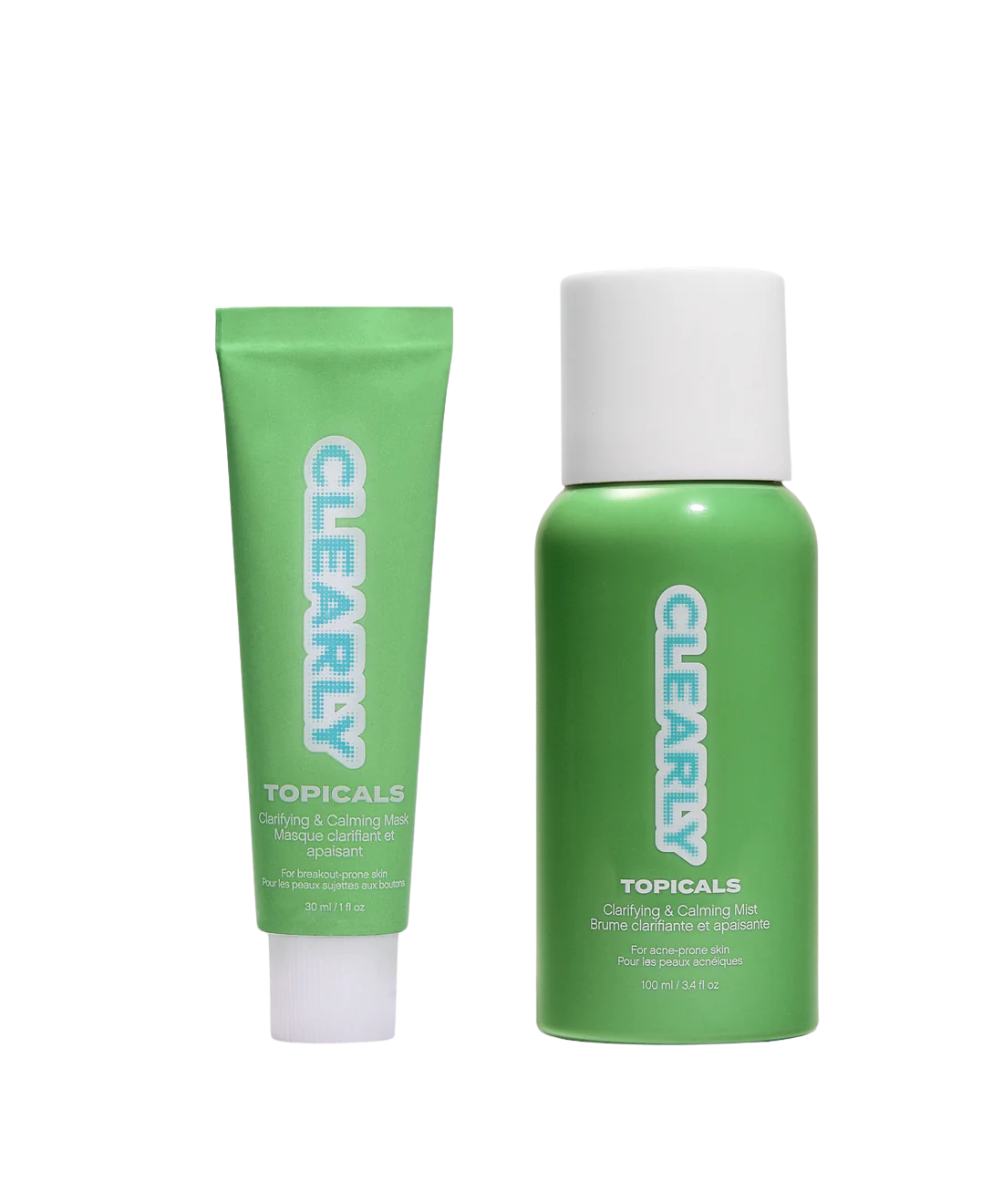 Een tweestapsroutine die puistjes helpt verminderen, kalmeert én voorkomt, terwijl het de huidbarrière ondersteunt. Gebruik Clearly Mist dagelijks om acne te verminderen, talg te reguleren en de huidtextuur en teint egaal te houden. Gebruik Clearly Mask 2-3 keer per week, of wanneer nodig, om actieve puistjes te kalmeren en irritatie te verminderen.