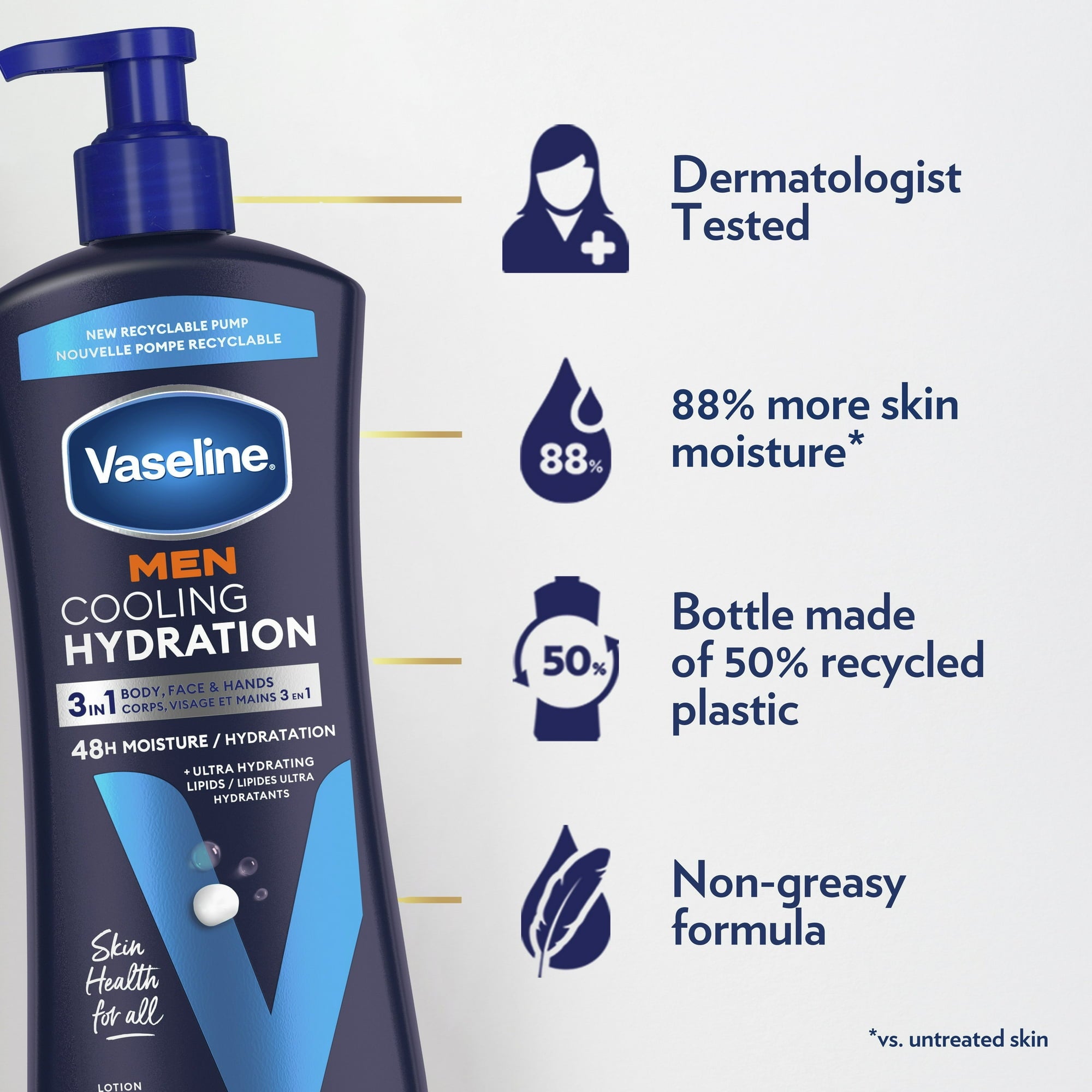 Dermatologisch geteste Vaseline bodylotion voor mannen met een niet-vette formule, verrijkt met verkoelende menthol voor een verfrist gevoel. Klinisch getest om 88% meer hydratatie te bieden in vergelijking met onbehandelde huid voor ultieme verzorging en verkoeling.