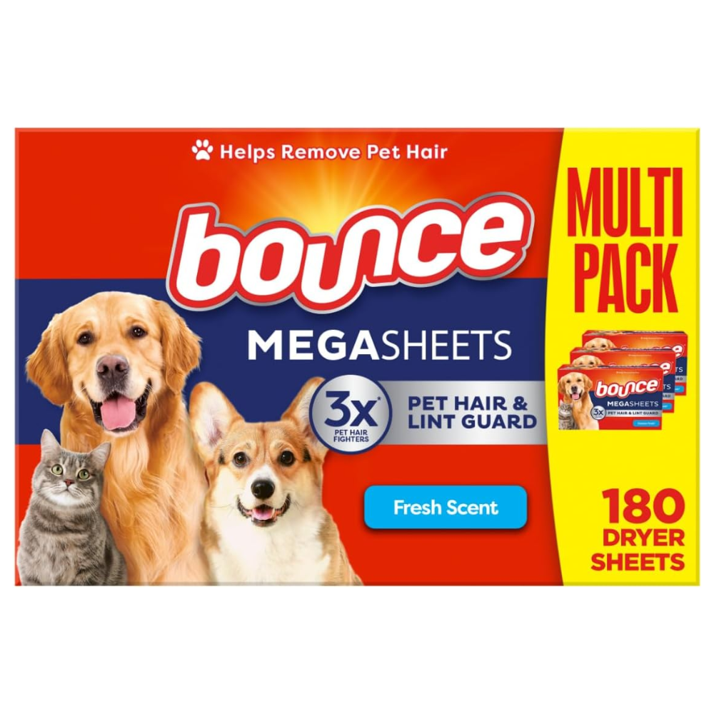 Bounce Pet Hair & Lint Guard Mega droogtrommeldoekjes met 3x anti-haar bescherming. Ontwikkeld om pluis en huisdierenhaar op kleding te verminderen en een frisse geur achter te laten.