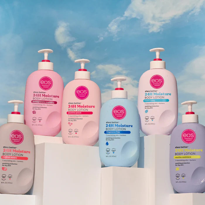 Bescherm en hydrateer je huid met voedende oliën + boters, waaronder natuurlijke sheaboter en sheaolie. De eos collectie met verleidelijke geuren, garandeert een optimale hydratatie gedurende 24 uur.