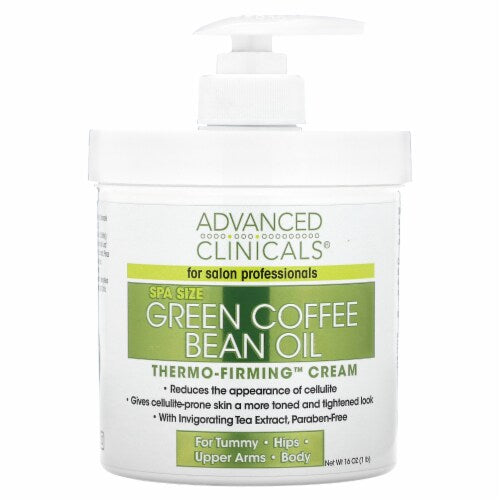 Advanced Clinicals Green Coffee Bean Oil Thermo-Firming Cream is een verstevigende crème voor gezicht en lichaam die helpt bij het verminderen van cellulite, verslapping en een doffe huid. De formule met groene koffieboonolie, cafeïne en algenextract stimuleert de huidcirculatie, verstevigt en maakt de huid gladder. Ideaal voor probleemzones zoals buik, dijen, armen en hals. Voor dagelijks gebruik.