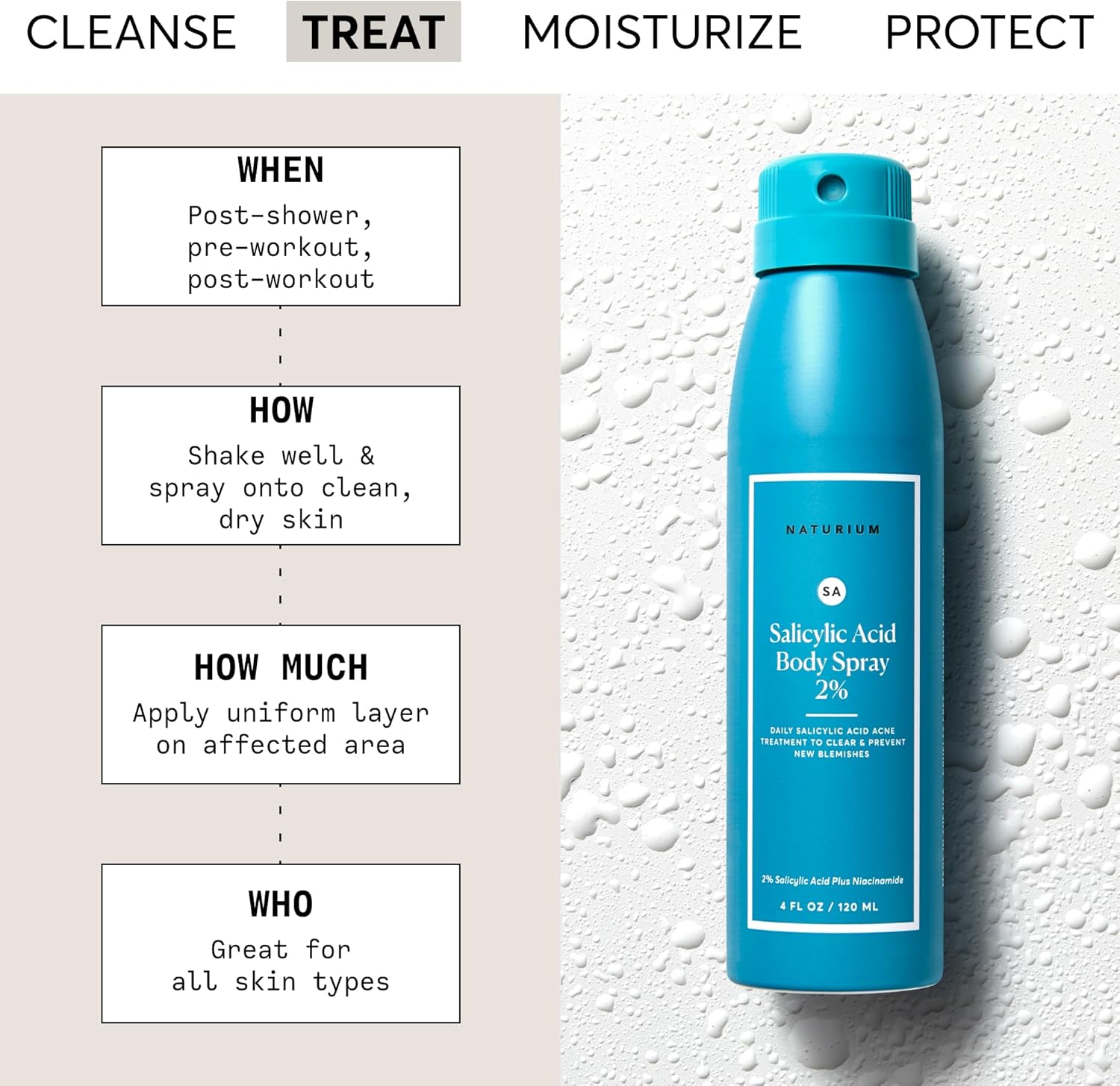 Onze salicylzuur body spray dient als dagelijkse salicylzuur acnebehandeling om bestaande onzuiverheden te verwijderen en nieuwe te voorkomen. Onze innovatieve 360-graden continue spray richt zich op acne en bestrijdt uitbraken op alle moeilijk bereikbare plekken.