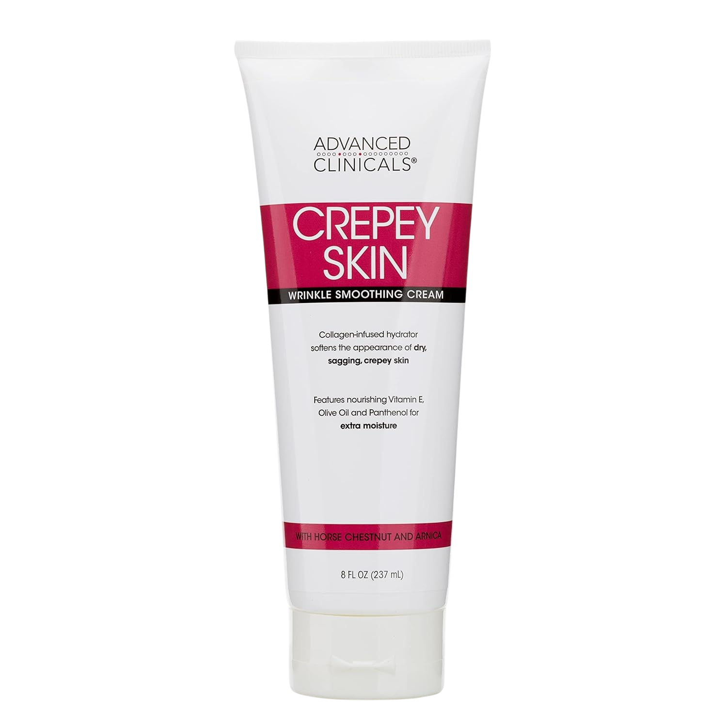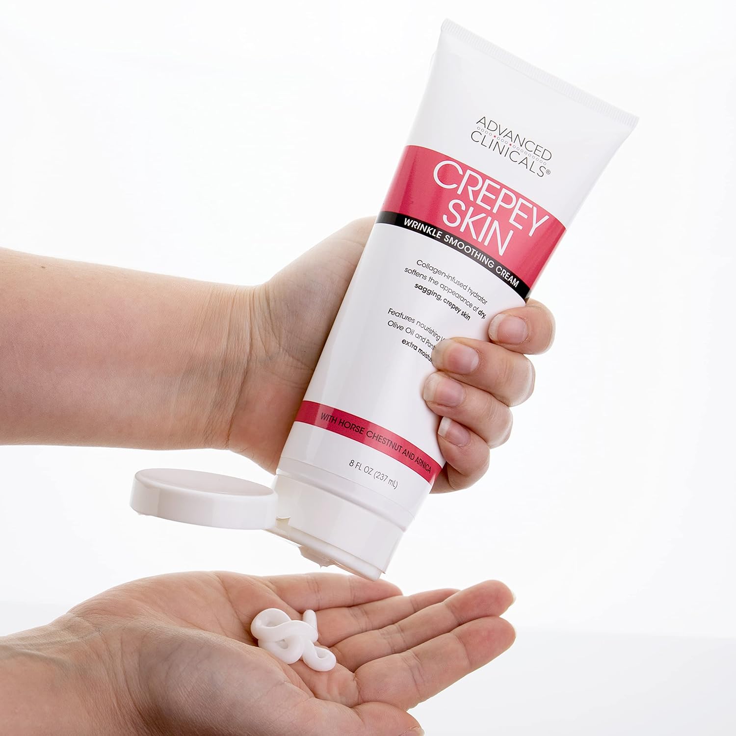 Advanced Clinicals Crepey Skin Wrinkle Smoothing Cream is speciaal ontwikkeld voor een slappe, dunne en gerimpelde huid. De rijke formule helpt de huid te verstevigen, glad te maken en intens te hydrateren. Ideaal voor probleemzones zoals bovenarmen, knieën, hals en decolleté. Bevat krachtige ingrediënten zoals hyaluronzuur en sheaboter. Voor dagelijks gebruik, parabeenvrij.