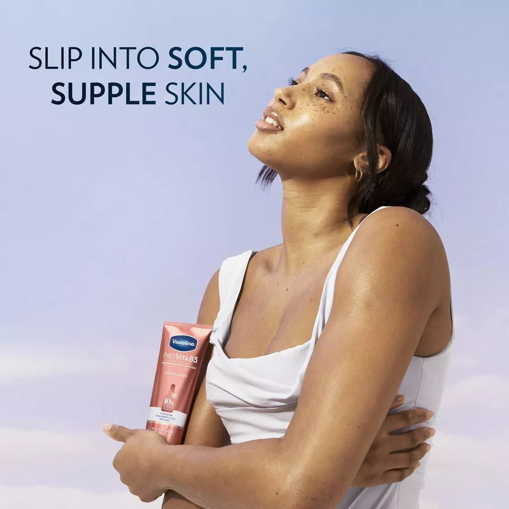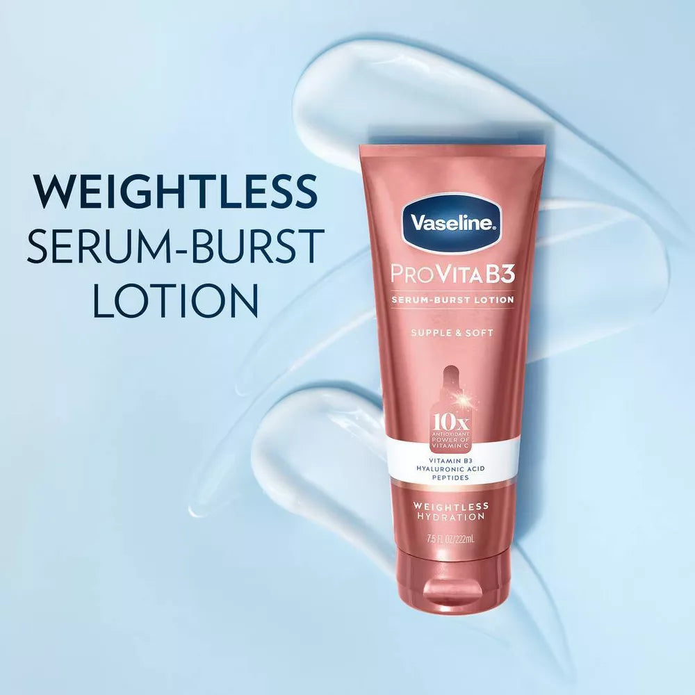 Vaseline Supple & Soft Pro VitaB3 Serum Burst Lotion is een innovatieve bodylotion die verandert in een serum bij het aanbrengen. De lichte, ademende formule hydrateert de huid de hele dag zonder vet aan te voelen. 9 van de 10 gebruikers ervaren de lotion als licht en makkelijk aan te brengen over het hele lichaam.